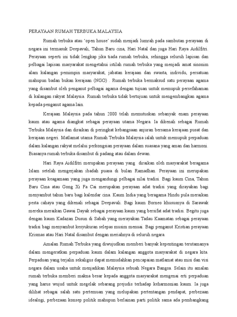 Dari perspektif yang lain amalan rumah terbuka dapat membantu rakyat Malaysia memahami budaya kaum lain. KARANGAN CEMERLANG SPM - Kebaikan Amalan Rumah Terbuka Kebaikan Amalan Rumah Terbuka Amalan rumah terbuka sudah menjadi lumrah untuk sambutan perayaan di negara ini termasuk Hari Raya Aidilfitri Deepavali Tahun Baru Cina dan Hari Krismas. Biasanya kedua sisi tersebut menghadap ke jalan.